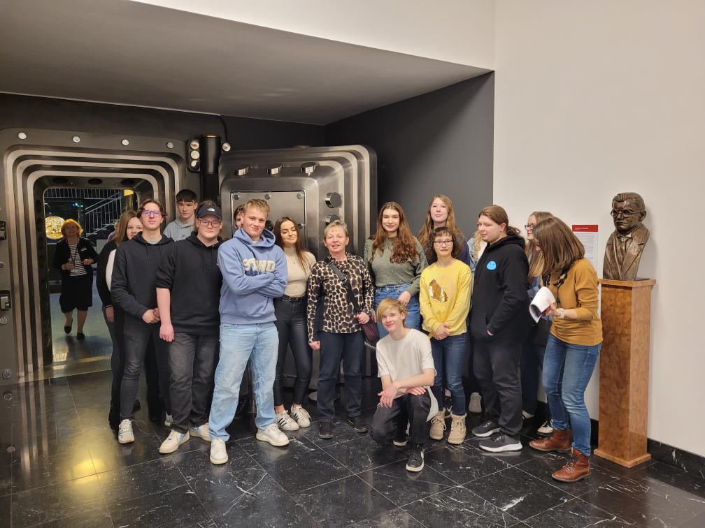 Po kontrole nás odvedli do druhého patra sklepení, kde jsme prostřednictvím krátkého poutavého videa zahájili prohlídku. Teprve poté jsme skrz 32 tunové ocelové dveře trezoru prošli k hlavní části výstavy. Milá průvodkyně nám objasnila vše ohledně historie vývoje peněz a mnohé další. Jako nejzajímavější shledáváme informace o výroční minci vyrobenou ke sto letům založení československé měny, která, jak jsme zjistili, má nominální hodnotu 100 milionů korun a hmotnost 130 kilogramů. Nese znaky Čech, Moravy a Slezska, pod nimiž je velký znak ČNB s prvním československým kolkem a vše obklopují lipové listy, jakožto symbol české státnosti doplněné o srpy obilí představující symbol hojnosti.