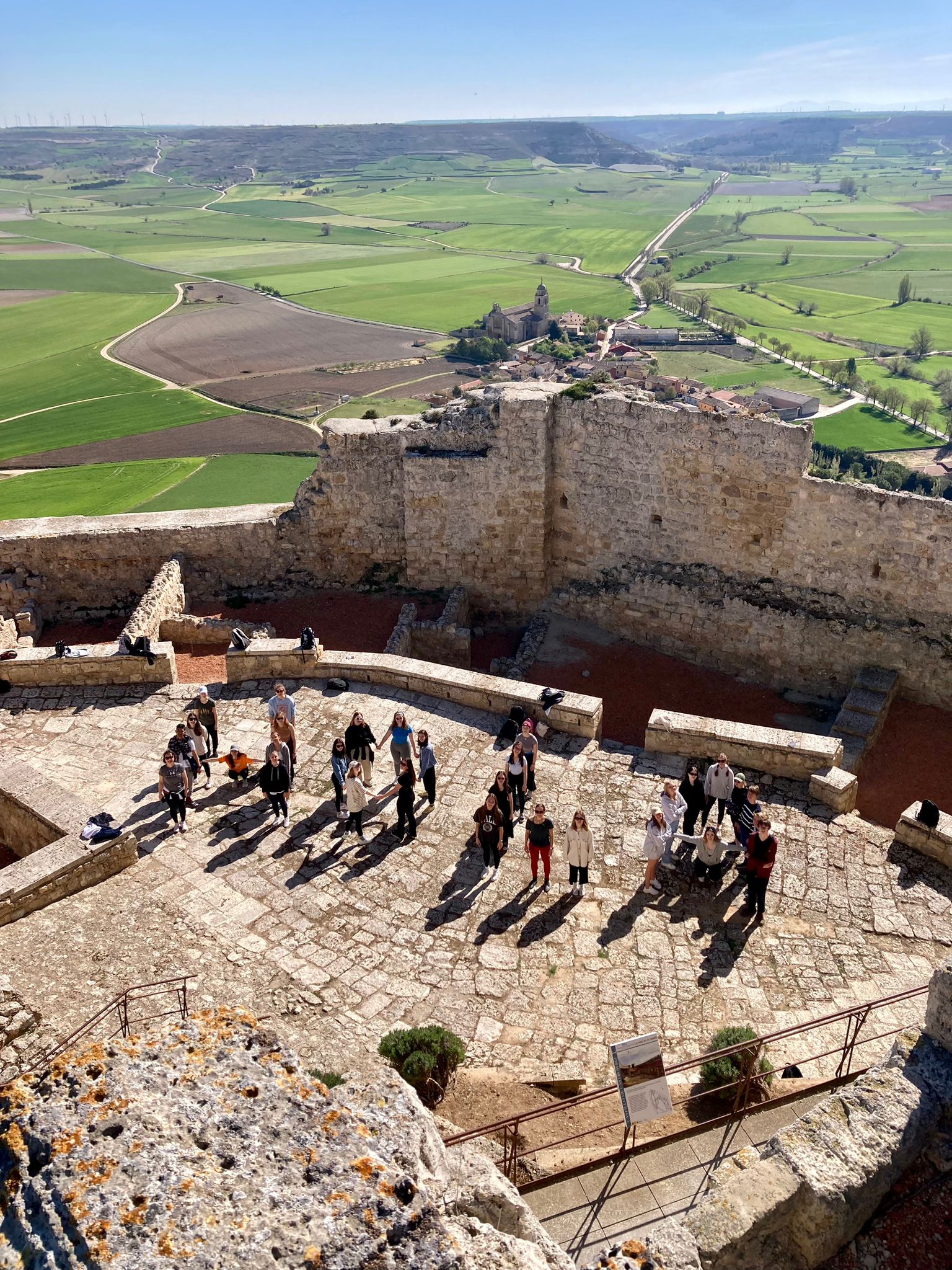 Vydali jsme se tematicky do středověku, do dob, kdy se rodilo současné španělské království. Poznávali jsme nejvýznamnější města s úchvatnými historickými centry, na chvíli se částečně stali poutníky na Svatojakubské cestě - Camino francés. Také jsme vystoupali na zříceninu středověkého hradu Castillo de Castrojeriz, odkud jsme se kochali výhledy na pro Čecha nezvyklou krajinu, rozsáhlou náhorní plošinu – mesetu a pak se v podhradí nechali pohostit tradičním několikachodovým menu, abychom pochopili, proč je po obědě nutná siesta. Zažili jsme i několik pohodových pikniků. Projížděli jsme španělským venkovem plným kamenných vesniček a vnímali silný kontrast mezi vylidněným venkovem a životem tepajícím městem. Prošli jsme se po jedinečném hradě Castillo de Coca či templářském hradě Ponferrada, který kdysi střežil bezpečnost poutníků do Santiaga de Compostela. V každém velkém městě na naší pouti jsme navštívili velkolepé katedrály a další významná místa. Mladí cestovatelé ráno dostali pracovní list s itinerářem: která místa samostatně najít, navštívit, originálně se vyfotit a zodpovědět nejrůznější otázky. Poznali jsme tak města Salamanca, Burgos, León a na závěr za ztížených povětrnostních podmínek Zamoru. Účastníci zájezdu byli neuvěřitelně stateční, neboť čelili naprosto odlišnému dennímu rytmu, zcela jinému způsobu stravování a počasí s nezvykle extrémními výkyvy teplot. Zažili doslova a do písmene kulturní šok a o tom to mělo být: poznat centrální Španělsko se vším všudy a stát se na krátkou chvilku jejím obyvatelem :-D To, co jim to výrazně usnadnilo, byla proslulá španělská otevřenost, ochota a vřelost, se kterou jsme se všichni setkávali na každém kroku. Troufáme si říct, že naši účastníci zájezdu opravdu porozuměli španělské povaze a naučili se užívat přítomný okamžik.