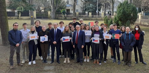 On Wednesday the 12th of January, 19 students from 1Aj and 2 students from 1B went on a study trip to Prague with their class teacher, Tony Laurel, where they attended a lecture on the importance of diplomacy and the functioning of an embassy and a consulate by both the ambassador of Portugal to the Czech Republic, Almeida Sampaio, and the respective consul, José Riço. The lecture took place on the grounds of the embassy and an interesting session of questions and answers finalized the meeting, which once again revealed the spirit of the IB philosophy within the students of 1Aj. Presents of goodwill were also exchanged between the students and the ambassador.