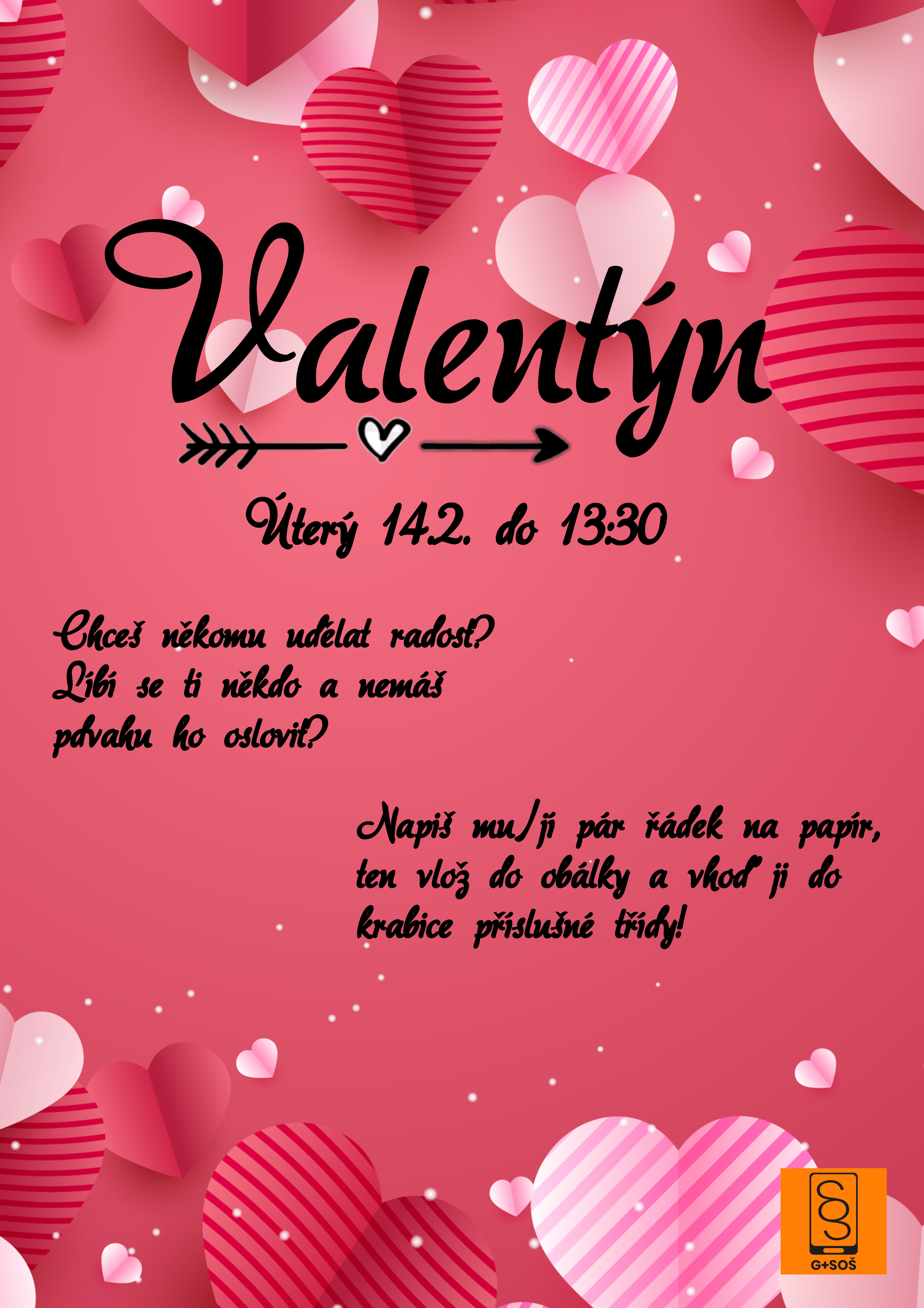 V úterý 14. února si obě naše části školy připomněli svátek zamilovaných. Jak na střední odborné škole, tak na gymnáziu mohli studenti vhodit lístek do krabice dané třídy a vyjádřit tak lásku, či obdiv danému studentovi, či studentce. Objevila se i přáníčka člověku, který vám něčím pomohl, nebo poradil. I učitelé letos dostali 11 vzkazů od žáků. Novinkou však byla možnost poslat psaníčko z gymnázia na soš a naopak. Děkujeme studentskému parlamentu za celou organizaci.