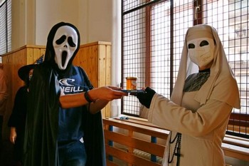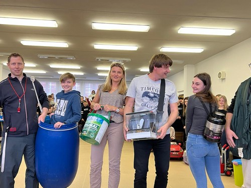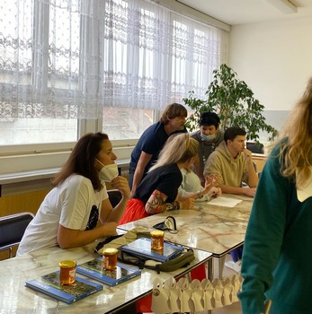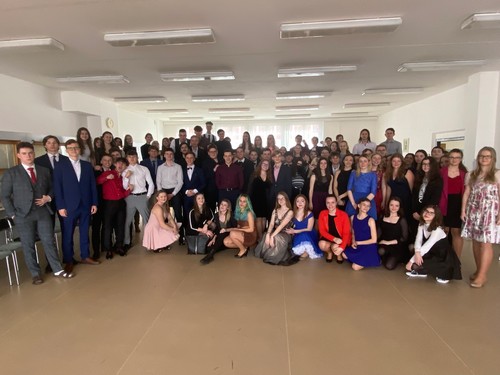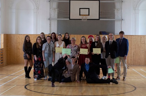 Všichni účastníci se sešli o velké přestávce tradičně v prostorách naší jídelny, aby se zde zúčastnili vyhodnocení nejatraktivnější a nejoriginálnější “tašky”. Mezi třídami zvítězila - na nižším gymnáziu - třída sekunda, na vyšším pak třída 1.B. Nejoriginálnějšími se pak stala popelnice Jáchyma Šmata z 1.B a pojízdné křeslo Alžběty Poláčkové ze sekundy, které v opěradle schovalo pár sešitů a učebnic.