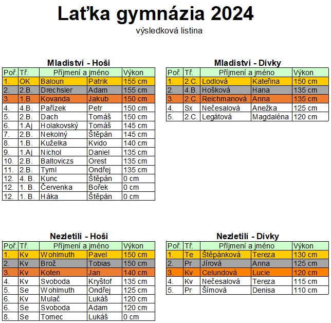 Dne 17. 12. 2024 proběhl v hale 27. ročník Laťky gymnázia za účasti víc než 30 závodníků. Vykony hodné uznání jsou součástí výsledkové tabulky.