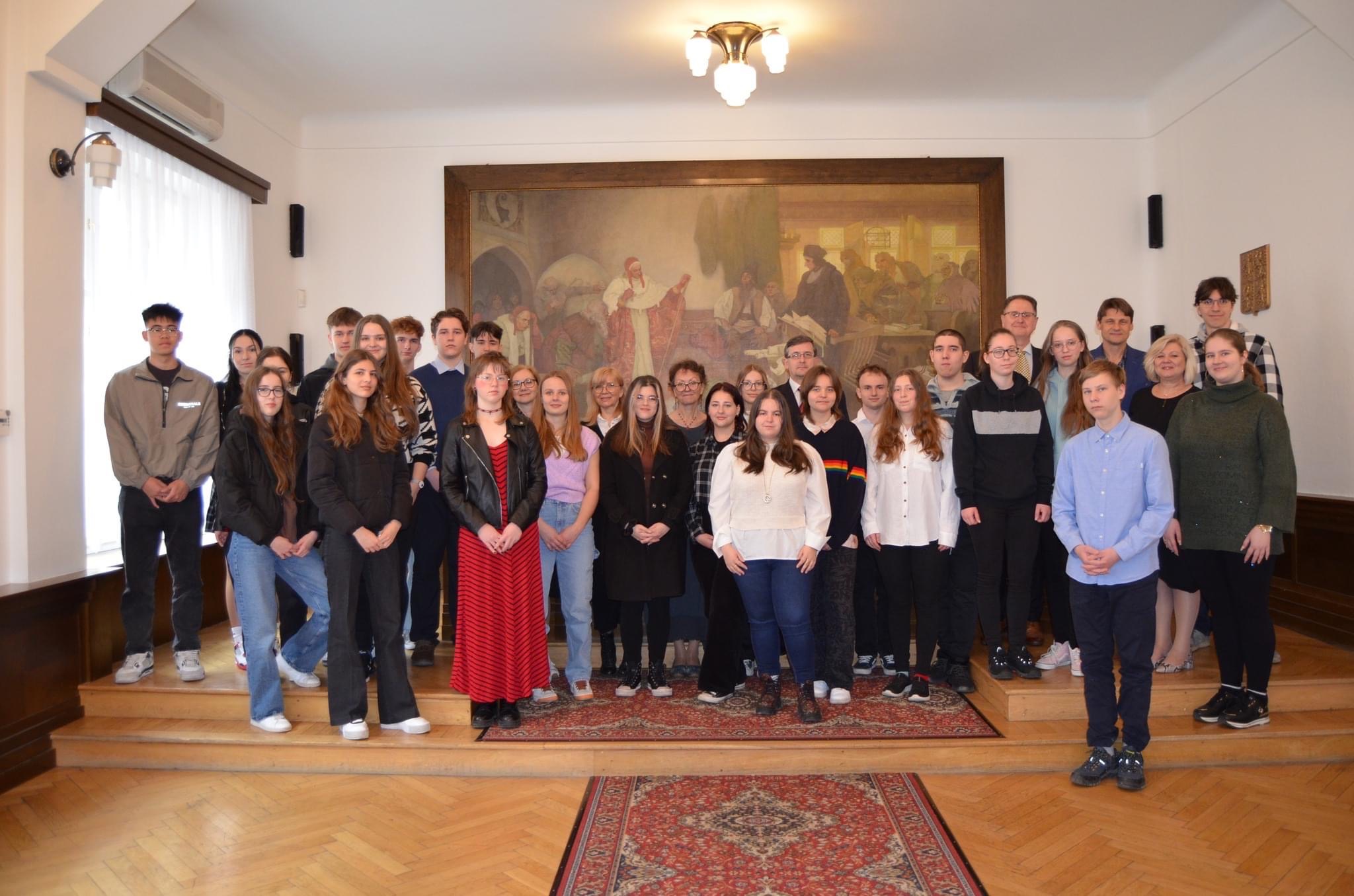 V týdnu od 25. do 28. dubna 2023 k nám po dlouhé odmlce konečně přijeli žáci a učitelé z trnavského gymnázia. Ve středu je v obřadní síni přivítal starosta města Rokycan Ing. Tomáš Rada, ukázal jim originál Muchova obrazu a seznámil je i s historií našeho města.