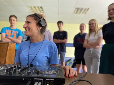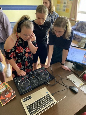 V rámci poslední hudební výchovy si studenti 2.B vyzkoušeli, jakým způsobem se mixuje současná elektronická hudba. Naše bývalá žákyně Anna Poláčková jim představila hudební styly jako např. Drum &Bass a Electronic dance music a sami studenti si pak zkusili, jak nelehké je sladit dva hudební motivy, vygradovat je do dropu a vůbec ovládat techniku mixážního pultu.