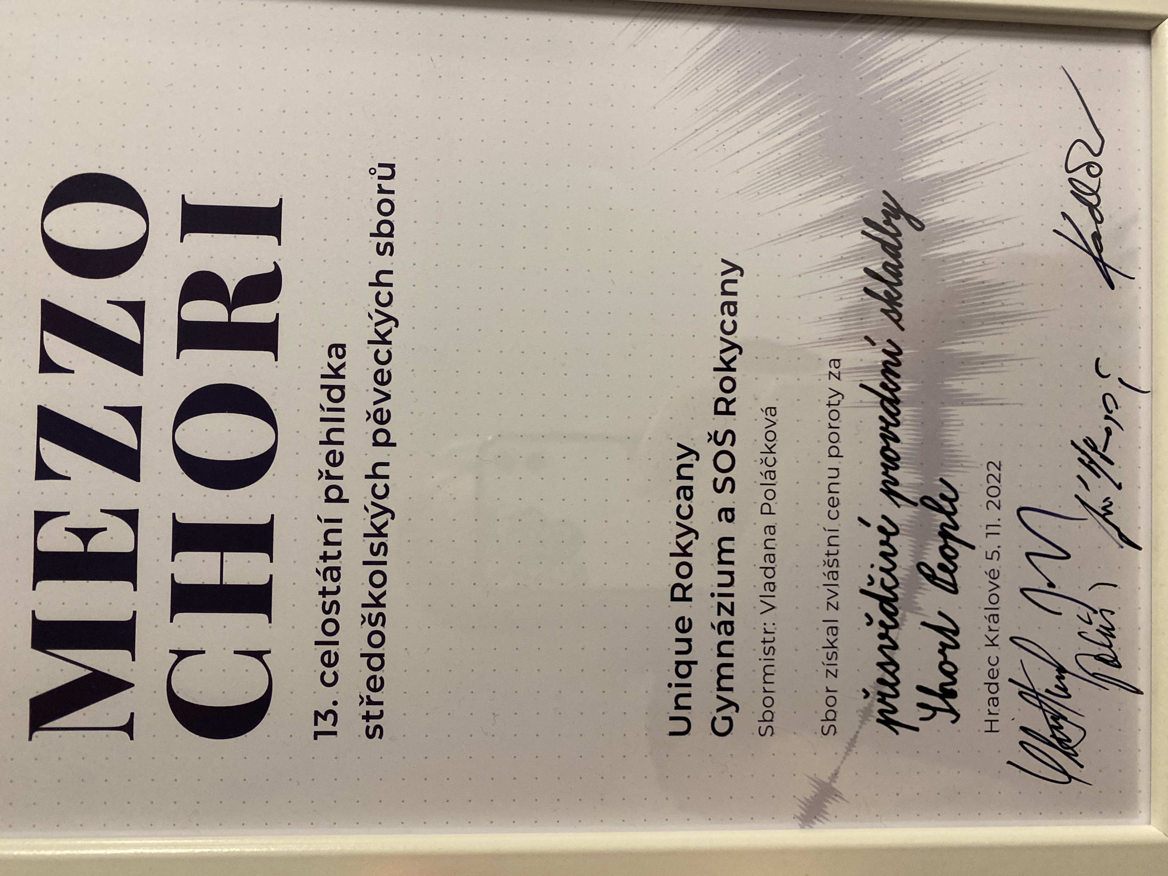 O víkendu 4.- 6. listopadu 2022 se náš středoškolský pěvecký sbor Unique Rokycany vydal na celostátní přehlídku Mezzochori v Hradci Králové. Díky získání zlatého pásma na krajské soutěži v březnu se naši zpěváci dostali mezi deset nejlepších sborů z České republiky, viděli jejich výkony, posoudili různorodý repertoár a setkali se také se svými vrstevníky z různých koutů našeho státu.