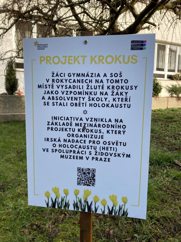 Ve spolupráci s Židovským muzeem si připomínáme oběti z řad židovských studentů našeho gymnázia, kteří zahynuli během druhé světové války v koncentračních táborech. V listopadu studenti G+SOŠ zasadili před budovu našeho gymnázia do země cibulky krokusů, které na jaře vykvetou žlutou barvou a připomenou tak ostatním zmařené životy židovských žáků. Dnes přibyly k již rašícím rostlinkám informační panely se jmény obětí a popisem projektu.
