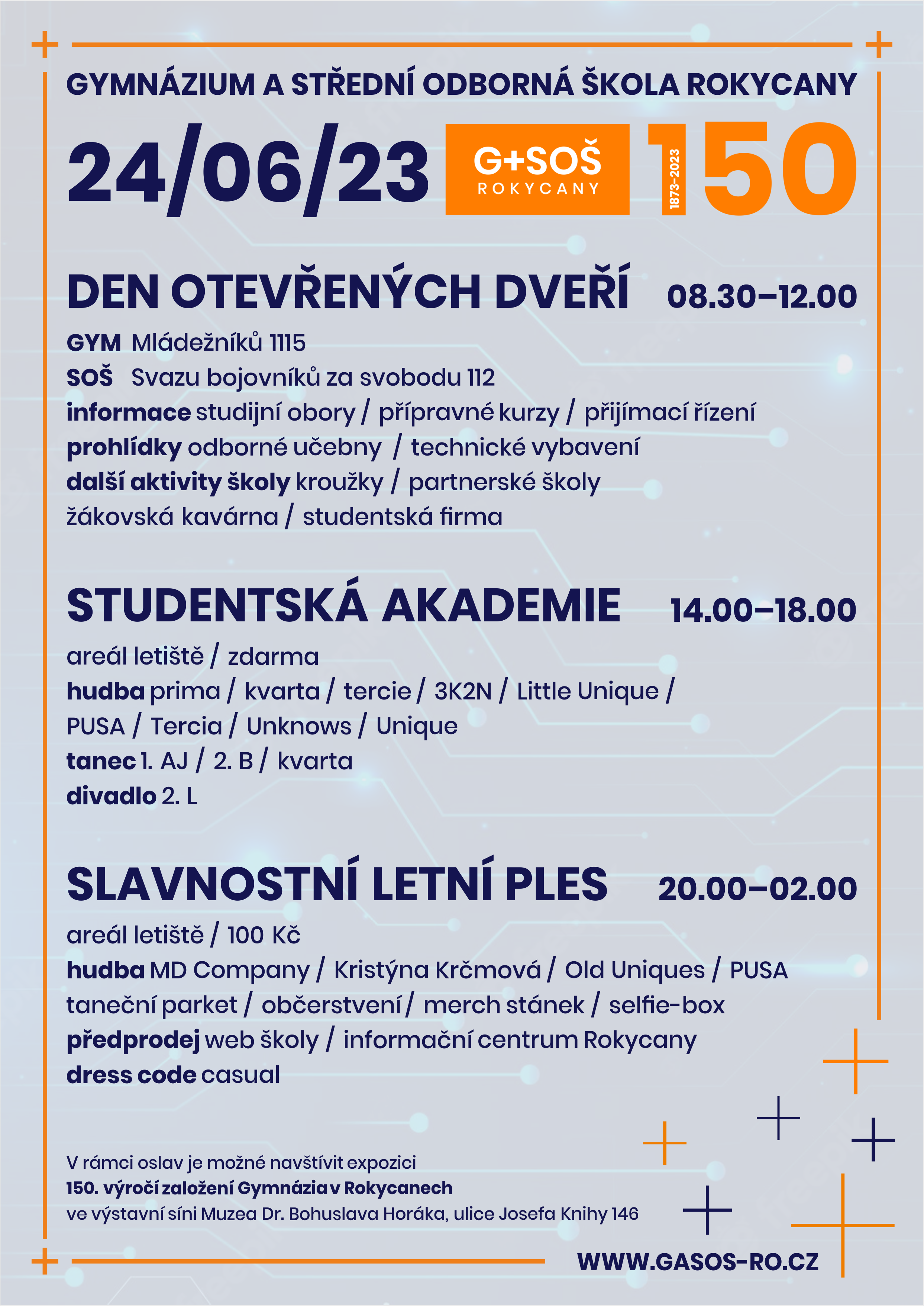 Učitelé a žáci Gymnázia a SOŠ Rokycany vás srdečně zvou na hlavní den oslav 150. výročí založení školy.
