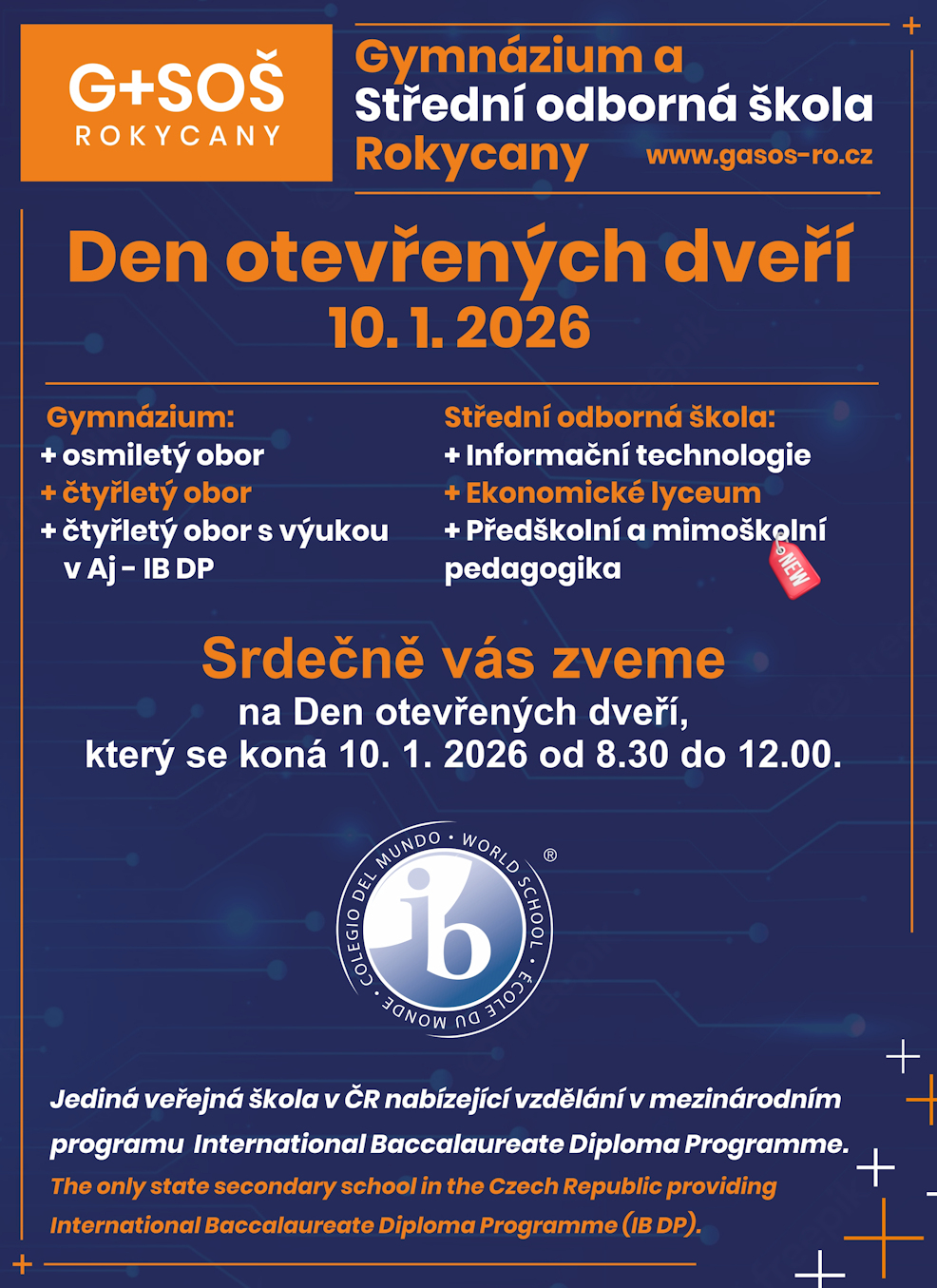 srdečně Vás zveme na Den otevřených dveří který se koná v sobotu dne 10. 1. 2026 od 8.30 do 12.00 hodin. Přijďte se podívat, co všechno Vám můžeme nabídnout a jak Vám můžeme pomoci naplnit Vaše vzdělávací a profesní cíle. Poskytneme vám podrobné informace o našich studijních programech a školních vzdělávacích plánech, včetně nového oboru Předškolní a mimoškolní pedagogika. Zjistíte, jaké pedagogické principy a jaký přístup k žákům se snažíme uplatňovat. Dozvíte se více o aktivitách školy, jako je mezinárodní spolupráce nebo dobrovolnická činnost.