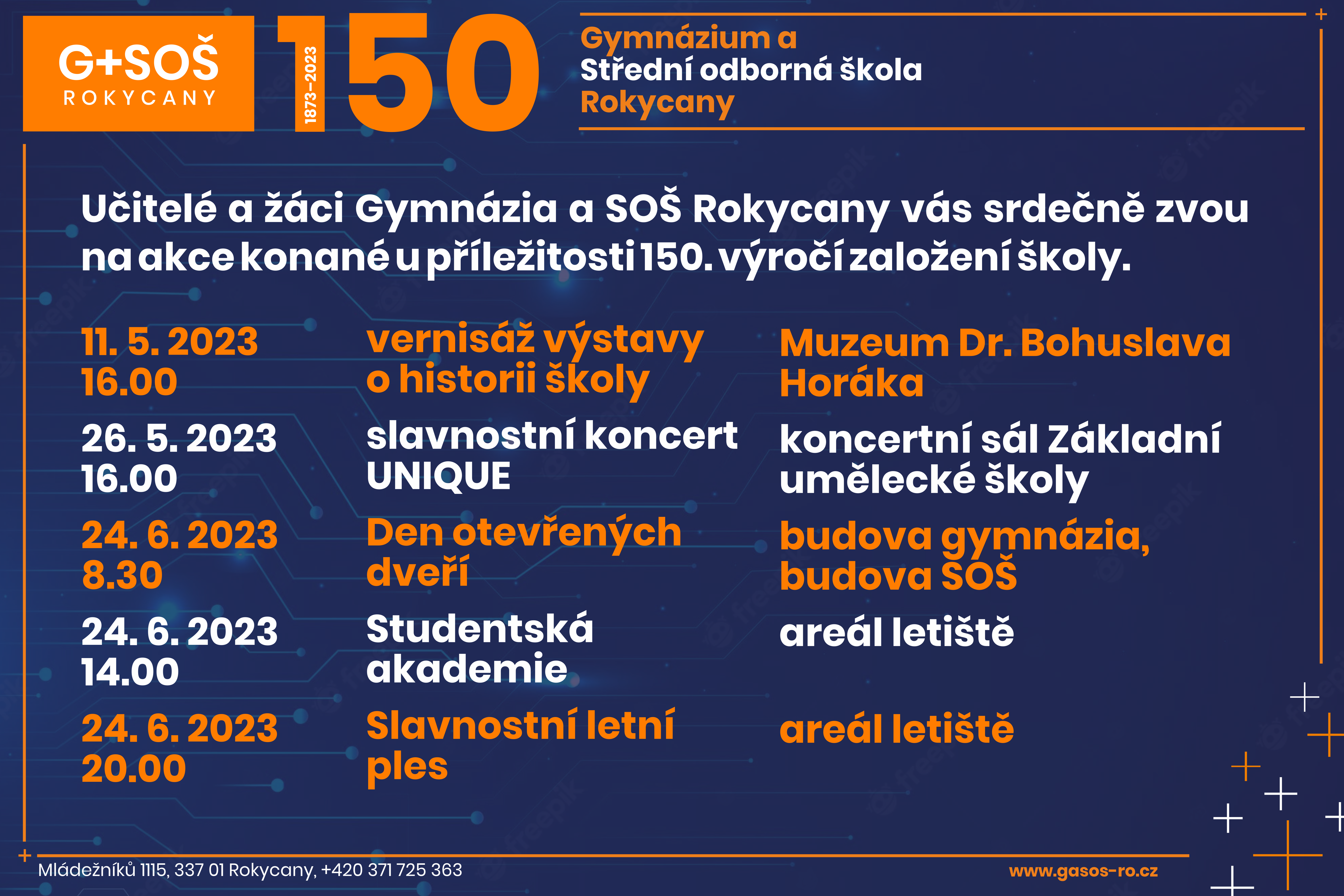 Učitelé a žáci Gymnázia a SOŠ Rokycany vás srdečně zvou na akce konané u příležitosti 150. výročí založení školy.