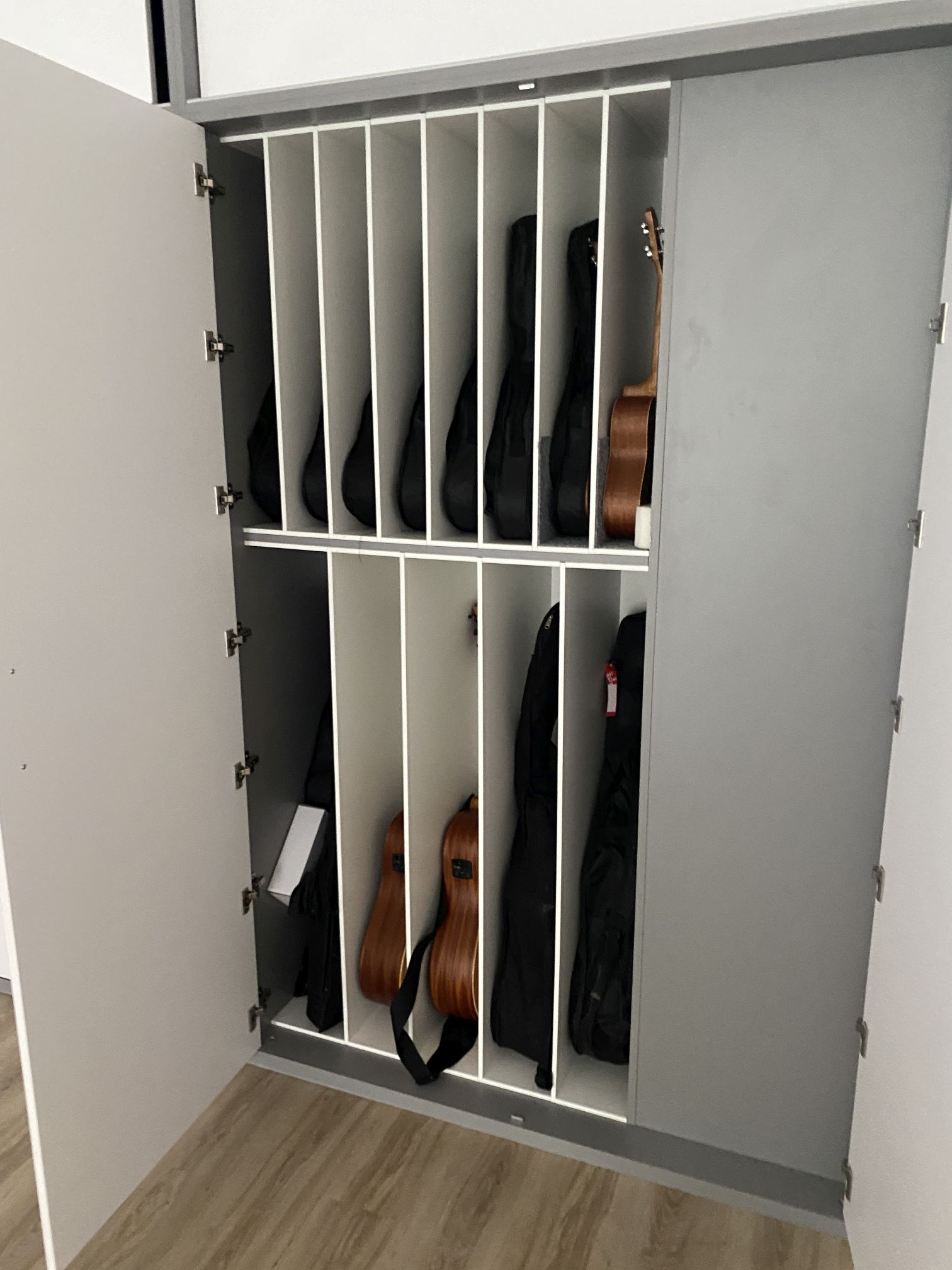 Součástí rekonstrukce je také zakázkový nábytek, který umožňuje efektivní a bezpečné uložení veškerého vybavení včetně hudebních nástrojů. Výuku obohacuje i velká interaktivní LED tabule, která přináší nové možnosti práce s hudebním materiálem.